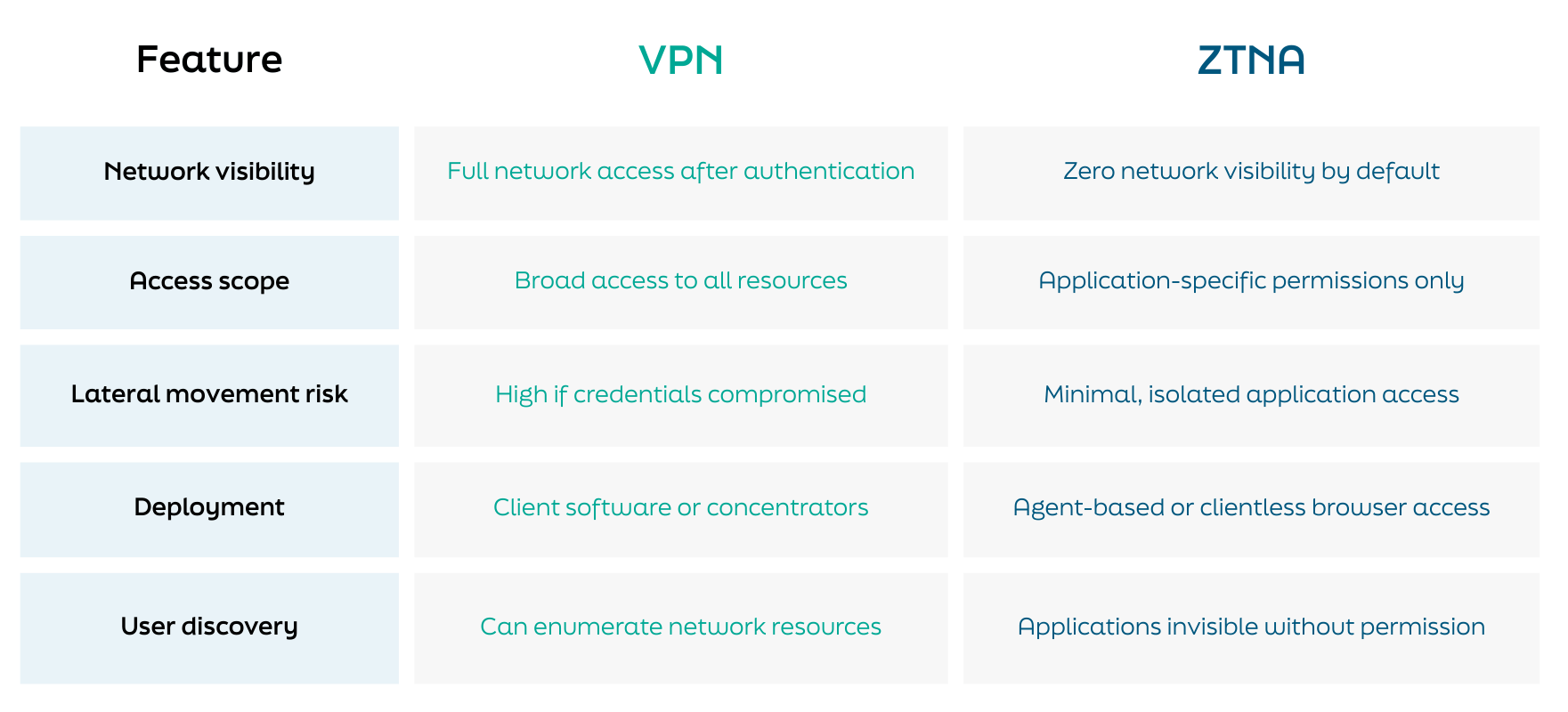 Zero trust network access provides secure application access without exposing your network. Traditional VPNs grant broad network access once authenticated. ZTNA grants access to specific applications only, making the network infrastructure invisible.