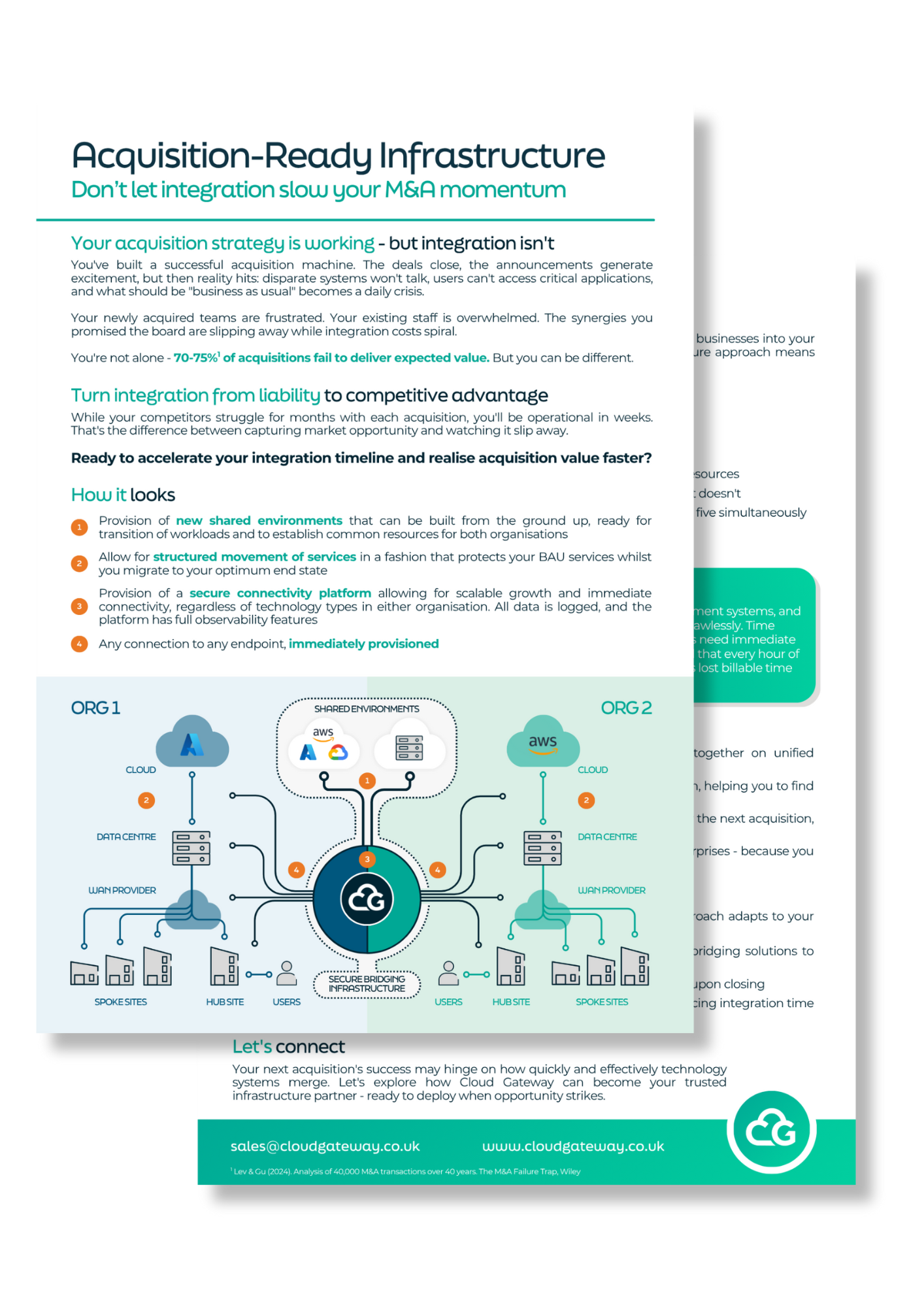 Post-acquisition IT integration shouldn't derail your growth strategy. While 70-75% of acquisitions fail to deliver expected value due to integration challenges, Cloud Gateway's bridging infrastructure approach enables you to connect acquired businesses in weeks, not months.